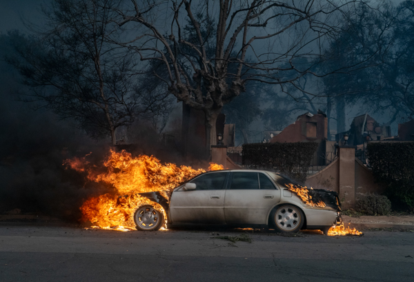 I found other car photos that stood out from the wildfire cliché. In one scene Grillot photographed (above), a sedan’s hood and trunk are engulfed in flames. The middle of the vehicle is smudged with soot, but has yet to burn. In the background lies the toppled ruin of a destroyed home. The past, present and future of the fire appear in one frame.