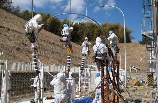 Workers connect transmission lines to restore electric power to the tsunami-crippled Fukushima nuclear power plant in Japan. Photo: Tokyo Electric Power Company.