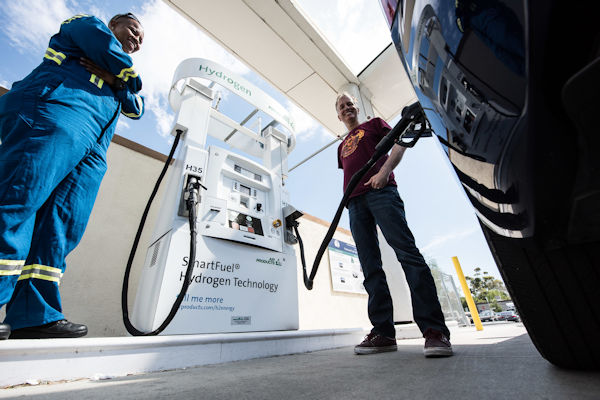 | Hydrogen has advantages as a fuel, including its gasoline-like portability. But key to its importance is its climate friendliness. Above, a hydrogen vehicle at a fueling station in Irvine, Calif. in 2017. Photo: National Renewable Energy Lab/Dennis Schroeder, Flickr Creative Commons. Click to enlarge. |