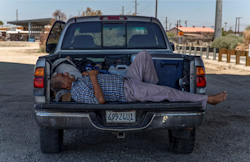 | A farmworker sleeps in the shade of the Avenue 66 Bridge in Mecca, California. Photo courtesy Irfan Khan/Los Angeles Times. |