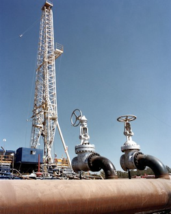 | Drilling rig with brine pipeline. Photo: U.S. Department of Energy via Flickr Creative Commons (United States government work). |