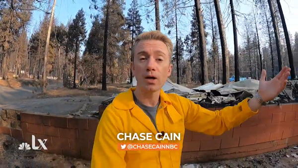 | Chase Cain of NBC’s LX news service says he now sees it as his responsibility to make the connection between extreme weather and climate change, such as in the reporting above on California wildfires. Image: NBCLX via YouTube screenshot. |