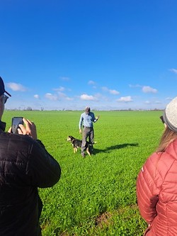 | Nino the Dog interrupts farm owner Eric Buzby's explanation of cover crops. Photo: Ava Chatlosh. |