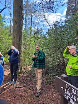 | Hawk Mountain Sanctuary Senior Research Biologist Dave Barber answers questions from SEJ attendees at a lookout on April 4, 2024. Photo: Daniel Schoenherr. |
