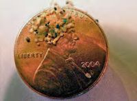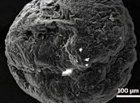 | Using fine mesh nets, researchers skimmed the surfaces of the Great Lakes in 2012 and 2013 for tiny bits of plastic known as microbeads. | Microbeads are so small, that it takes dozens of them to cover the head of Abraham Lincoln on a penny. | The weathering of a microbead from its time in the Great Lakes shows up clearly in this scanning electron micrograph. Photos: Courtesy 5 Gyres Institute. |