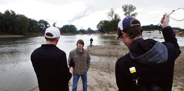 | Professor Adam Kuban (left) works with geology students Zach Korst (center, foreground) and Giovanni Alvarez (center, rear), and journalism student Todd “TJ” Dudley, as they prepare to tape a video segment at a river confluence. Photo by Dylan Hayes |