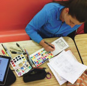 Illustrator Emily Coren at work on location; utilizing CamScanner software in her smart phone, she can upload PDF files of her completed work to her blog WalkaboutEm.com while still in the field. Photo: Courtesy Emily Coren. |
