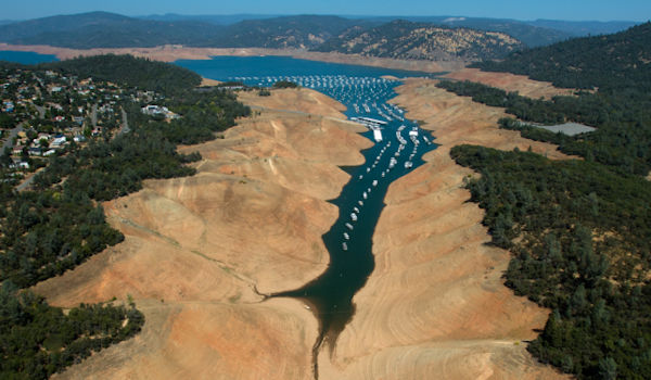 | Lake Oroville in drought (2014), courtesy of Kelly M. Grow, California Department of Water Resources. Click to enlarge. |